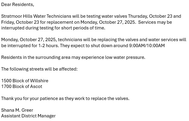 STRATMOOR HILLS WATER VALVE TESTING AND REPLACEMENT NOTICE - OCT 23 - OCT 27